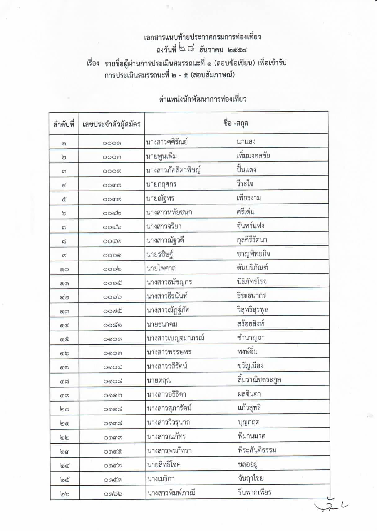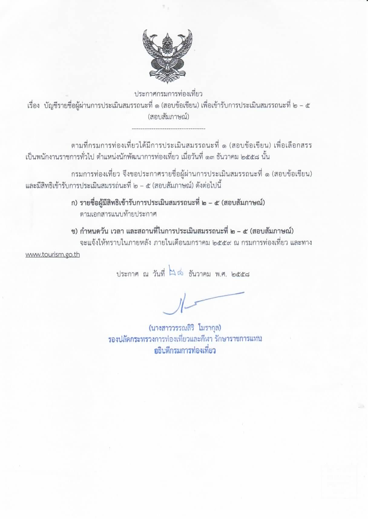 บัญชีรายชื่อผู้ผ่านการประเมินสมรรถนะที่ ๑ (สอบข้อเขียน) ตำแหน่งนักพัฒนาการท่องเที่ยว เพื่อเข้ารับการประเมินสมรรถนะที่ ๒-๕ (สอบสัมภาษณ์) วันที่ประกาศ 29 ธ.ค. 2558 ดาวน์โหลดไฟล์เอกสาร