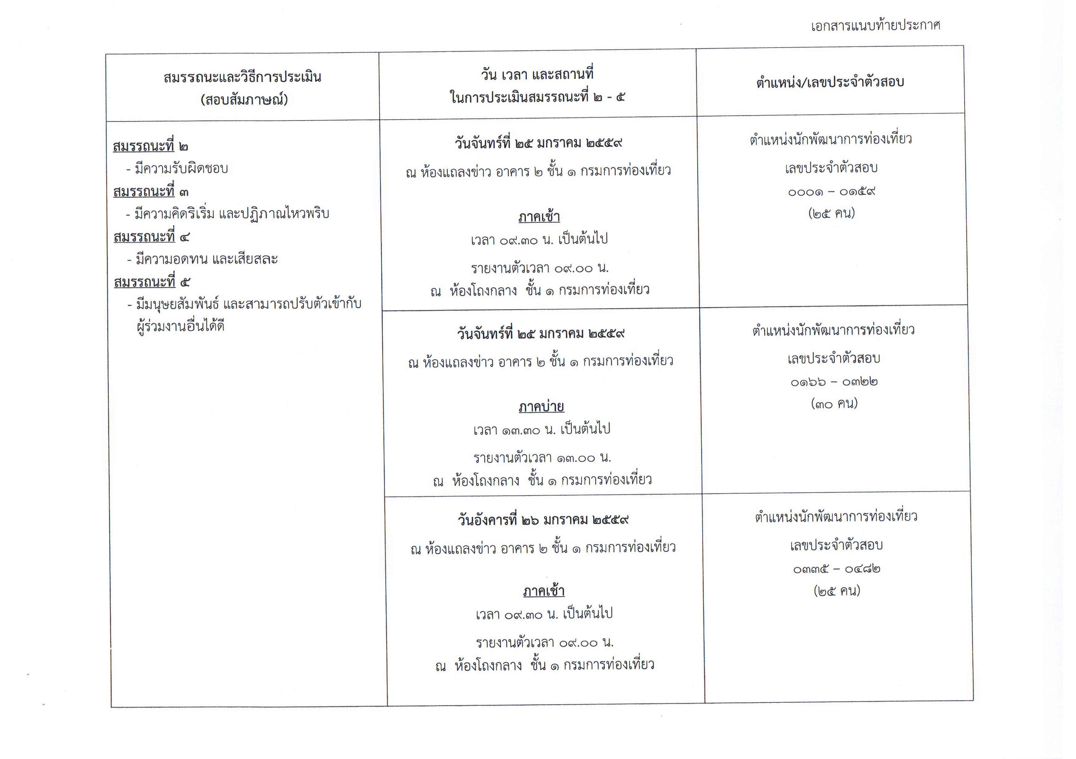 มาตรฐานการท่องเที่ยวไทย มาตรฐานบริการเพื่อการท่องเที่ยวมาตรฐานแหล่งท่องเที่ยวมาตรฐานทะเบียนธุรกิจนำเที่ยว แผนความต่อเนื่อง ของกรมการท่องเที่ยว กฏหมายการท่องเที่ยว กฏกระทรวงกรมการท่องเที่ยวพรบ. นโยบายท่องเที่ยวแห่งชาติพรบ. ภาพยนตร์และวีดีทัศน์พระราชกฤษฎีการเปลี่ยนชื่อเป็นกรมการท่องเที่ยวพระราชบัญญัติการมาตรฐานแห่งชาติพระราชบัญญัติธุรกิจนำเที่ยว และมัคคุเทศก์กฏหมายกฤษฎีกา หน่วยงานภายในกรมการท่องเที่ยว สำนักทะเบียนธุรกิจนำเที่ยวและมัคคุเทศก์สำนักพัฒนาแหล่งท่องเที่ยวสำนักพัฒนาบริการท่องเที่ยวกองกลางกองกิจการภาพยนตร์และวีดิทัศน์ต่างประเทศกองพัฒนามาตรฐานบุคลากรด้านการท่องเที่ยวศูนย์เทคโนโลยีสารสนเทศกลุ่มพัฒนาระบบบริหารกลุ่มงานคุ้มครองจริยธรรมกลุ่มตรวจสอบภายใน หน่วยงานด้านการท่องเที่ยว ข้อมูลสารสนเทศการท่องเที่ยว รับเรื่องร้องเรียน สำหรับเจ้าหน้าที่กรมการท่องเที่ยว เข้าสู่ระบบอีเมล์กรมการท่องเที่ยวMail - GoIntranet กรมการท่องเที่ยวE-Libraryบทสรุปผู้บริหารประจำเดือนระบบสารสนเทศ กรมการท่องเที่ยว ศูนย์ข้อมูล DOC มุมการเจ้าหน้าที่ การเลื่อนเงินเดือนข้าราชการการเลื่อนค่าตอบแทนพนักงานราชการการเลื่อนขั้นค่าจ้างลูกจ้างประจำการเลื่อนระดับการโอน ย้าย บรรจุกลับแบบฟอร์ม กำหนดวัน เวลา และสถานที่ในการประเมินสมรรถนะที่ ๒-๕ (สอบสัมภาษณ์) วันที่ประกาศ 15 ม.ค. 2559 ดาวน์โหลดไฟล์เอกสาร