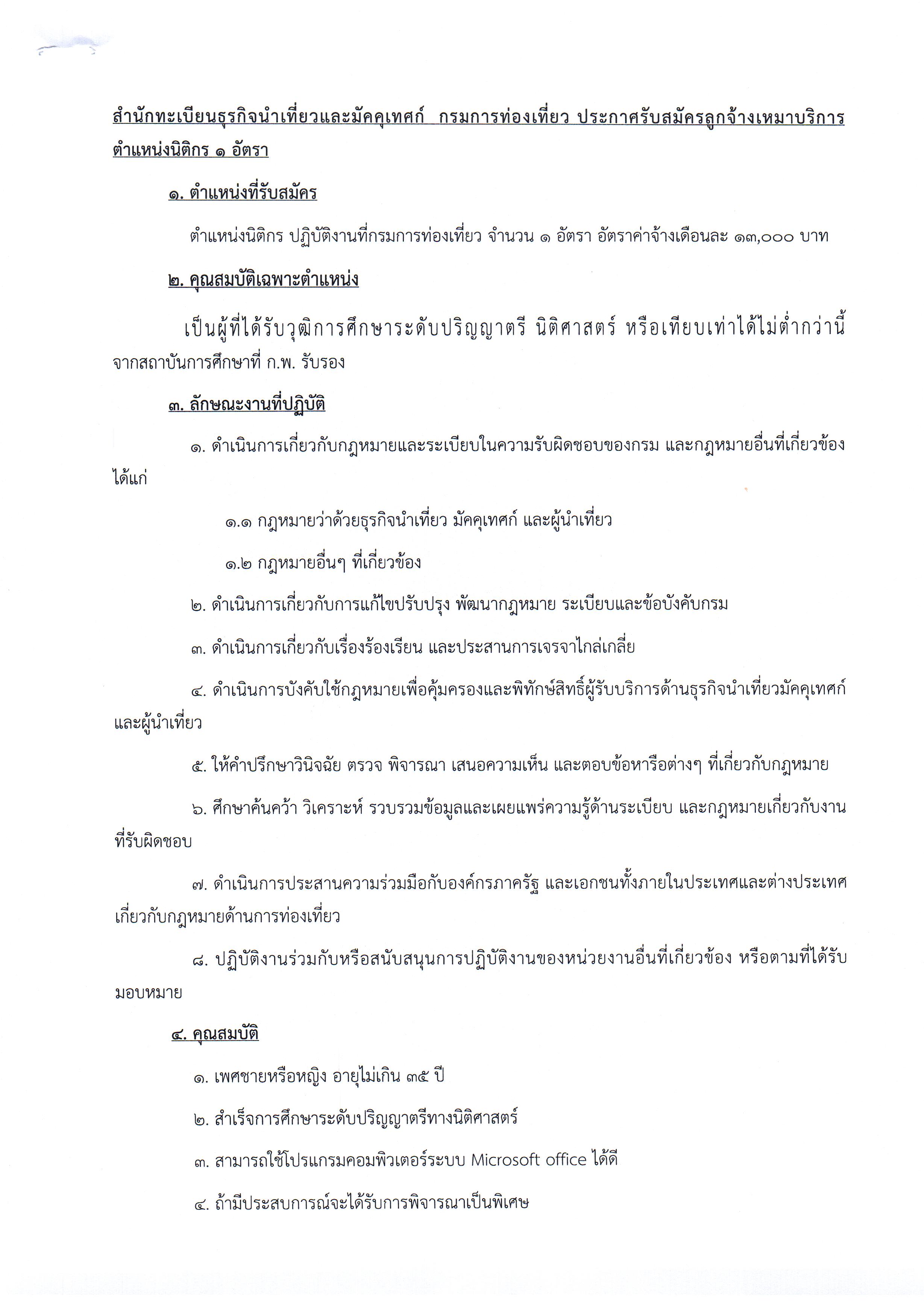 สำนักทะเบียนธุรกิจนำเที่ยวและมัคคุเทศก์ กรมการท่องเที่ยว ประกาศรับสมัครลูกจ้างเหมาบริการ ตำแหน่งนิติกร ๑ อัตรา วันที่ประกาศ 18 ก.พ. 2559 ดาวน์โหลดไฟล์เอกสาร