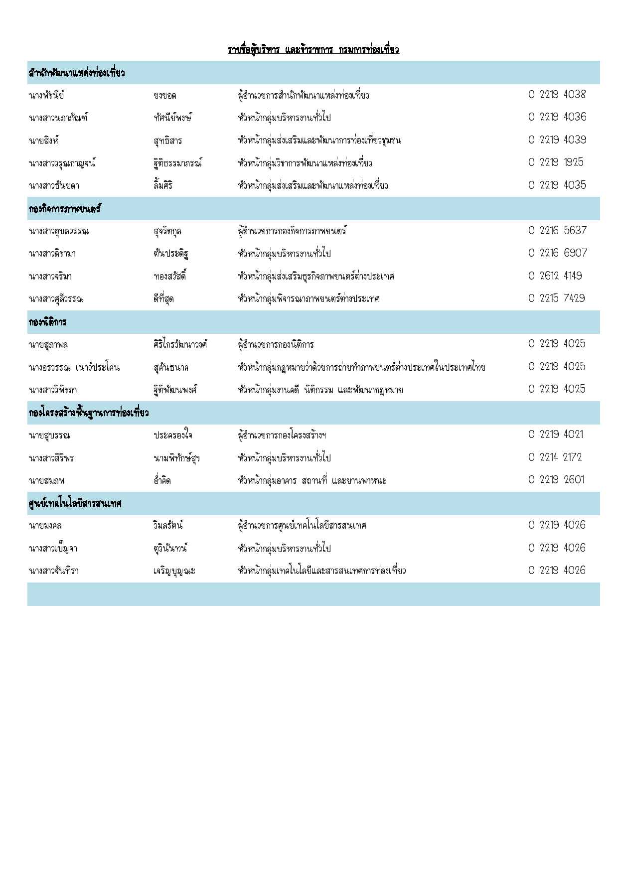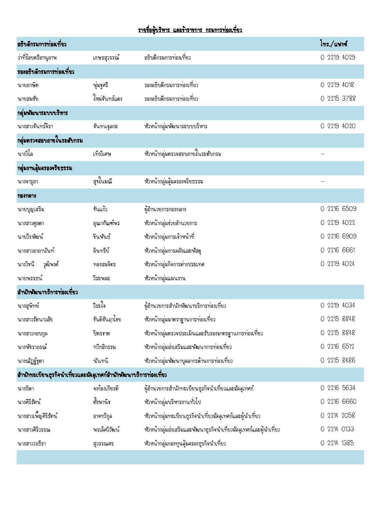 มาตรฐานการท่องเที่ยวไทย มาตรฐานบริการเพื่อการท่องเที่ยวมาตรฐานแหล่งท่องเที่ยวมาตรฐานทะเบียนธุรกิจนำเที่ยว แผนความต่อเนื่อง ของกรมการท่องเที่ยว กฏหมายการท่องเที่ยว กฏกระทรวงกรมการท่องเที่ยวพรบ. นโยบายท่องเที่ยวแห่งชาติพรบ. ภาพยนตร์และวีดีทัศน์พระราชกฤษฎีการเปลี่ยนชื่อเป็นกรมการท่องเที่ยวพระราชบัญญัติการมาตรฐานแห่งชาติพระราชบัญญัติธุรกิจนำเที่ยว และมัคคุเทศก์กฏหมายกฤษฎีกา หน่วยงานภายในกรมการท่องเที่ยว สำนักทะเบียนธุรกิจนำเที่ยวและมัคคุเทศก์สำนักพัฒนาแหล่งท่องเที่ยวสำนักพัฒนาบริการท่องเที่ยวกองกลางกองกิจการภาพยนตร์กองโครงสร้างพื้นฐานการท่องเที่ยวกองนิติการศูนย์เทคโนโลยีสารสนเทศกลุ่มพัฒนาระบบบริหารกลุ่มงานคุ้มครองจริยธรรมกลุ่มตรวจสอบภายใน หน่วยงานด้านการท่องเที่ยว ข้อมูลสารสนเทศการท่องเที่ยว รับเรื่องร้องเรียน สำหรับเจ้าหน้าที่กรมการท่องเที่ยว เข้าสู่ระบบอีเมล์กรมการท่องเที่ยวMail - GoIntranet กรมการท่องเที่ยวE-Libraryบทสรุปผู้บริหารประจำเดือนระบบสารสนเทศ กรมการท่องเที่ยว ศูนย์ข้อมูล DOC มุมการเจ้าหน้าที่ การเลื่อนเงินเดือนข้าราชการการเลื่อนค่าตอบแทนพนักงานราชการการเลื่อนขั้นค่าจ้างลูกจ้างประจำการเลื่อนระดับการโอน ย้าย บรรจุกลับแบบฟอร์ม รายชื่อข้าราชการ กรมการท่องเที่ยว วันที่ประกาศ 23 ก.ค. 2558